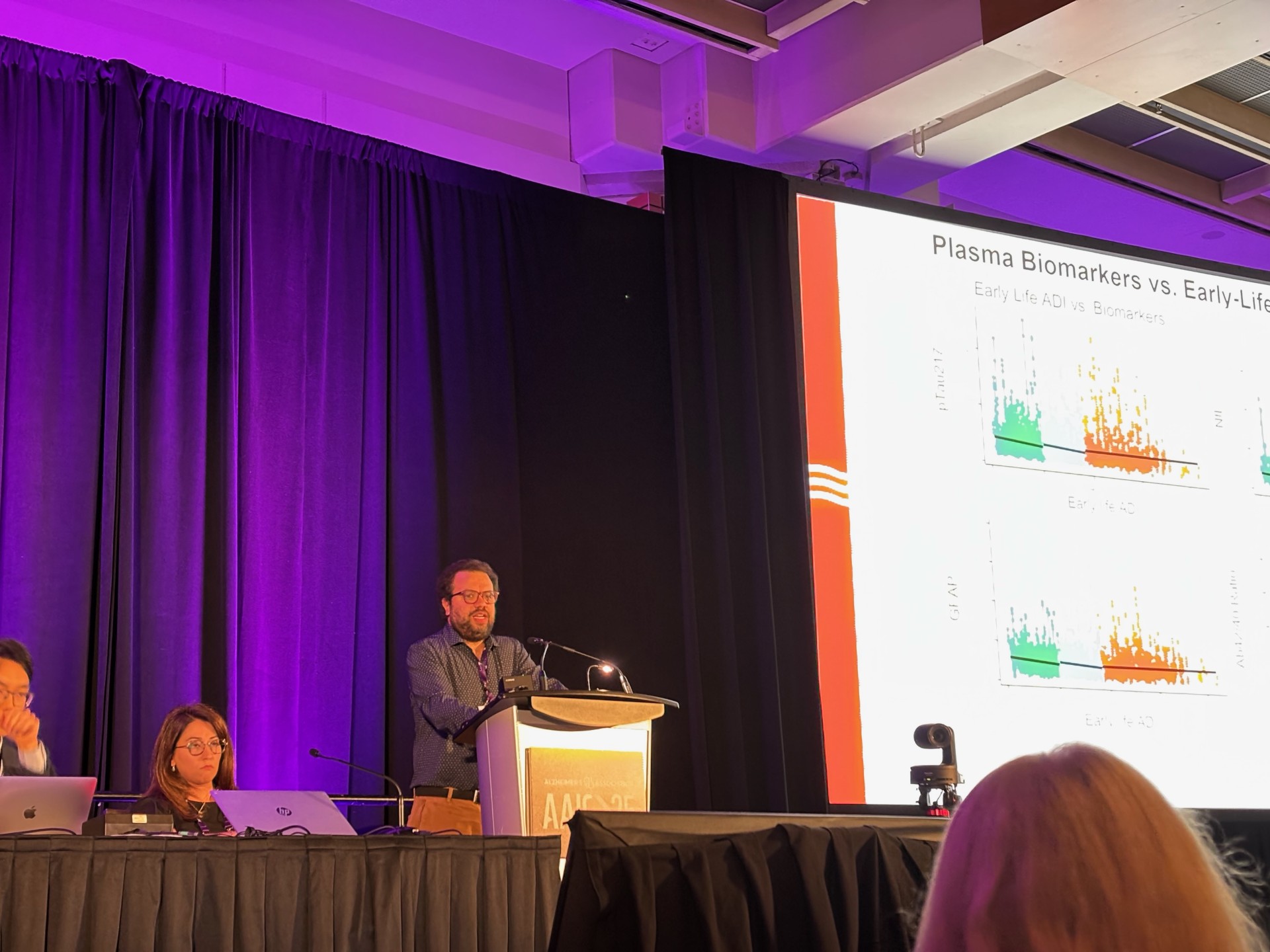 Postdoctoral Research Associate Jason Moody giving a talk on associations between neighborhood-level disadvantage and neuroimaging markers of microstructural neurodegeneration at AAIC 2024 in Philadelphia, PA. (July 2024)